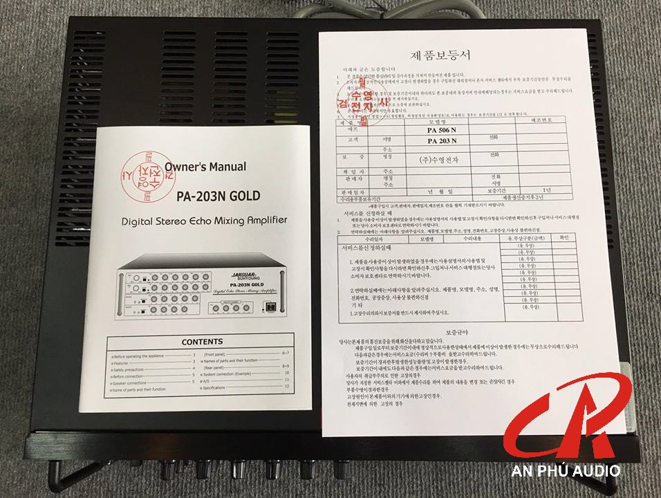 * Thứ nhất: Amply 203N liên doanh có đầy đủ sách HDSD và chứng nhận sản phẩm (Có dấu đỏ công ty) của đơn vị sản xuất Jarguar.